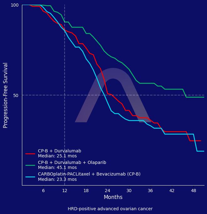 | PFS non-tBRCAm HRD-positive: 45.1 mos vs 25.1 mos vs. 23.3 mos (Only significant for durvalumab-olaparib arm: HR 0.46 [0.33-0.65])